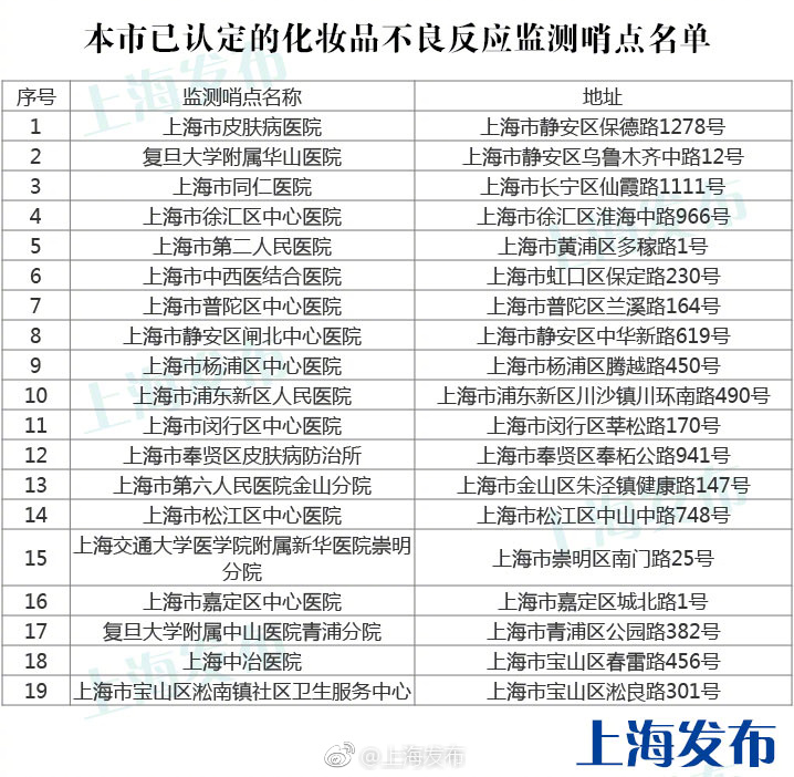 【你對(duì)化妝品產(chǎn)生過(guò)不良反應(yīng)嗎?這份監(jiān)測(cè)哨點(diǎn)名單你一定要收好!】//【你對(duì)化妝品產(chǎn)生過(guò)不良反應(yīng)嗎?這份監(jiān)測(cè)哨點(diǎn)名單你一定要收好!】#便民提示#有的化妝品可能會(huì)產(chǎn)生不良反應(yīng),需要及時(shí)收集,@上海食藥監(jiān) 和@健康上海12320 推進(jìn)了化妝品不良反應(yīng)監(jiān)測(cè)體系。如果你對(duì)化妝品產(chǎn)生不良反應(yīng),可以就近前往“本市已認(rèn)定的化妝品不良反應(yīng)監(jiān)測(cè)哨點(diǎn)名單”上的站點(diǎn)檢測(cè)及就診哦! ?