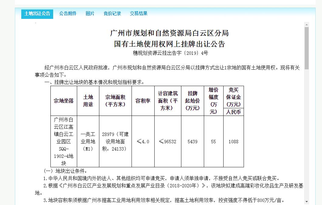白云工業(yè)園一宗地塊出讓,擬建高端智能化妝品研發(fā)基地