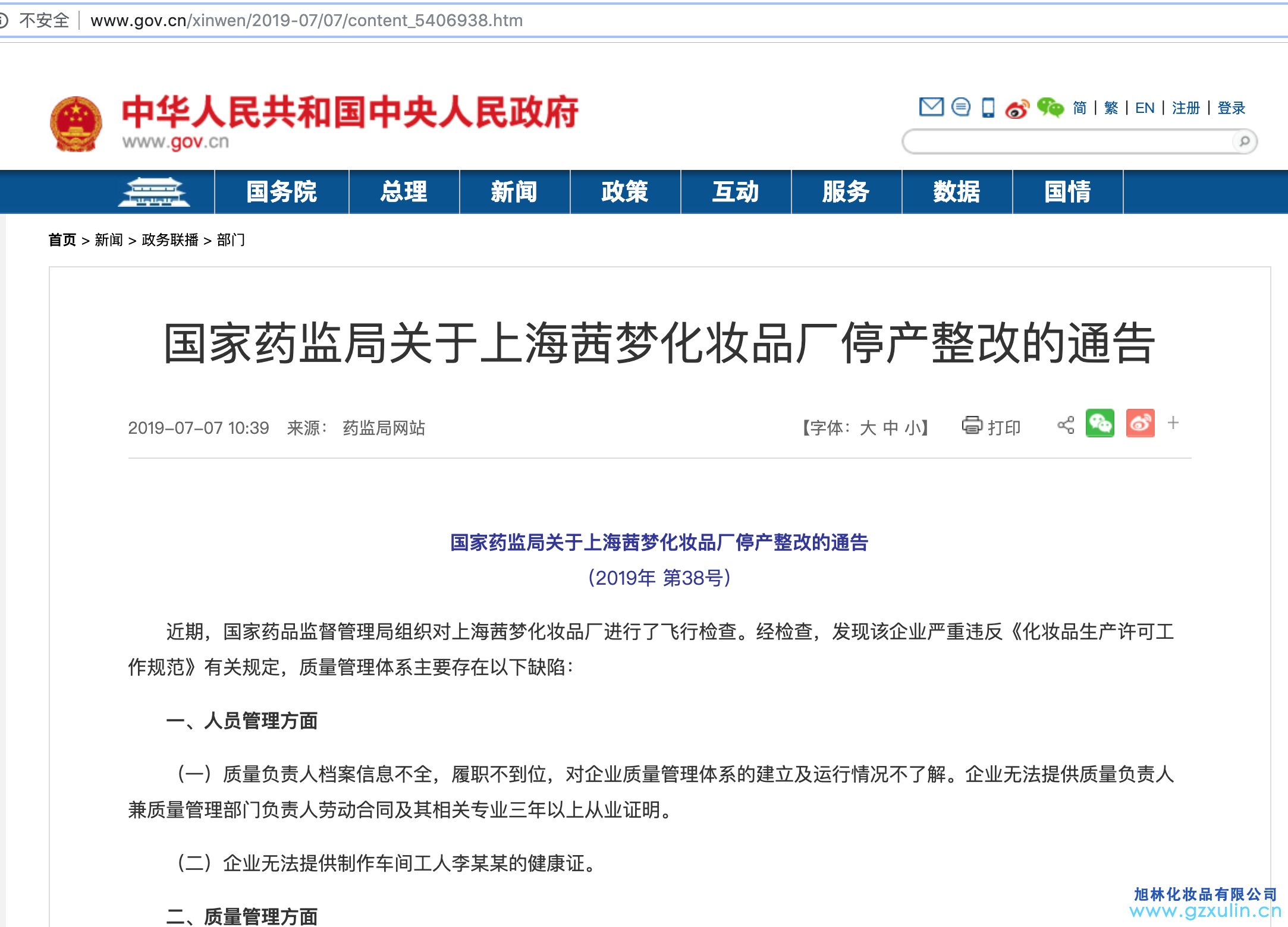 國(guó)家藥監(jiān)局關(guān)于上海茜夢(mèng)化妝品廠停產(chǎn)整改的通告